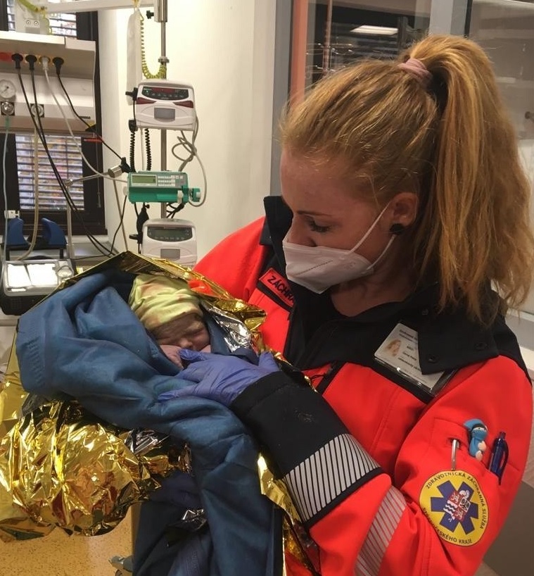:. Miminko přivedla na svět záchranářka v autě před nemocnicí. Zdroj: ZZS SČK